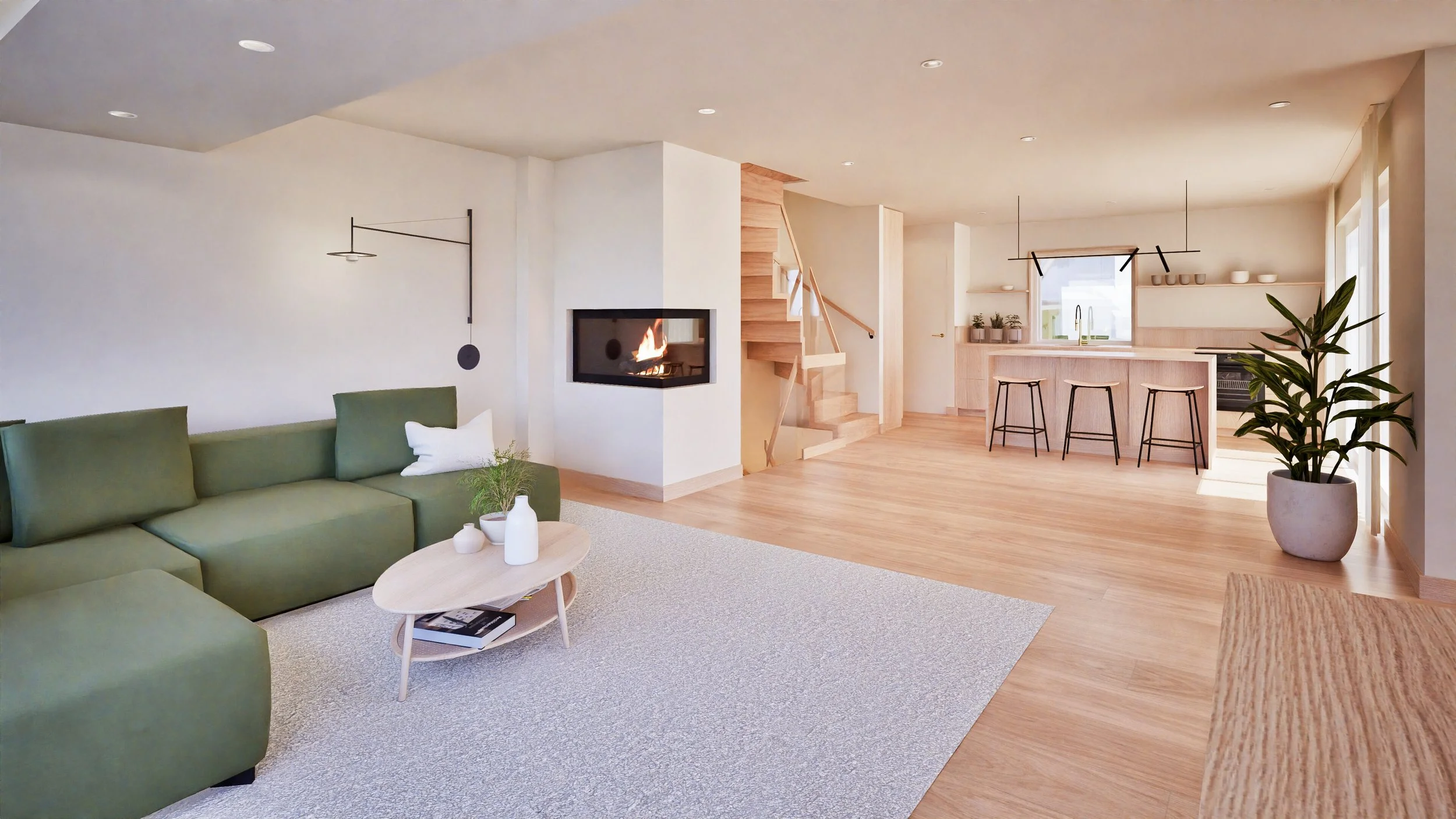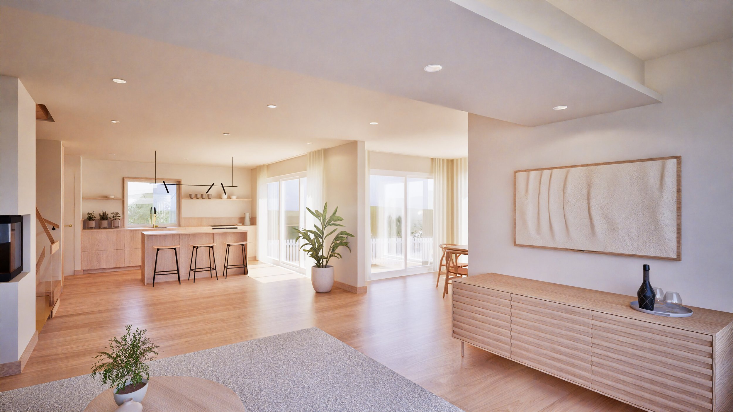 Interiøret ble utviklet som en forlengelse av de arkitektoniske grepene, med mål om å skape et lyst, moderne og helhetlig uttrykk. Den lyse materialpaletten, med myke innslag av treverk, gir rommene en lun og rolig atmosfære. Åpne flater og hvite vegger lar lyset vandre fritt gjennom rommene, og styrker forbindelsen mellom inne- og uterommene. Resultatet er et interiør med flyt, der dagslyset og omgivelsene får prege stemningen.