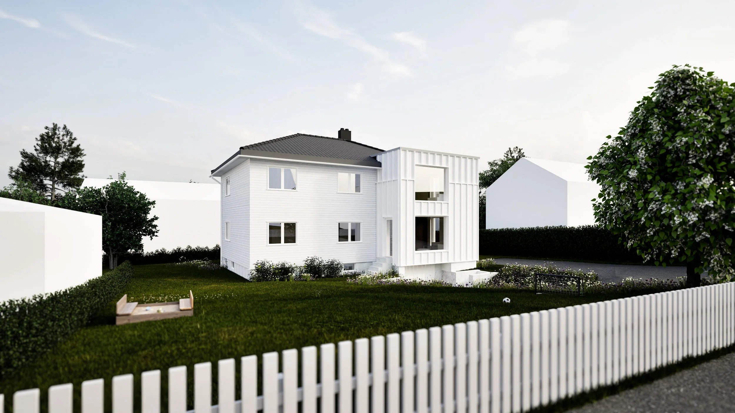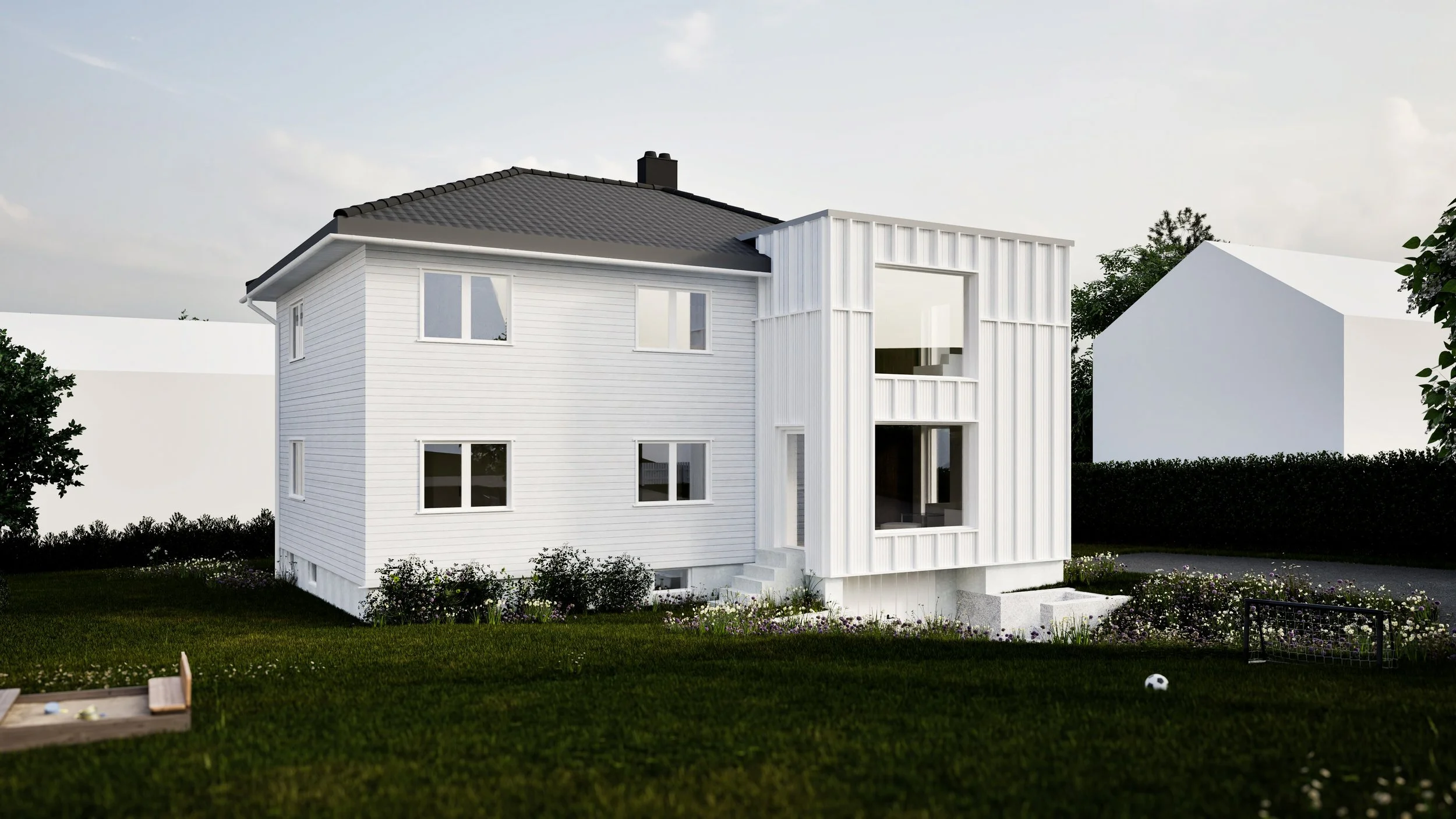 Den andre delen av prosjektet består av en utvidelse av boenhetenes stuer. Ved å bygge et trebygg over den eksisterende verandaen får boligen en ny del som gir rom for flere måter å samles på. Påbygget blir en naturlig og fleksibel forlengelse av oppholdsrommet, og gir boligen mer generøse fellesarealer, og rikelig med dagslys.